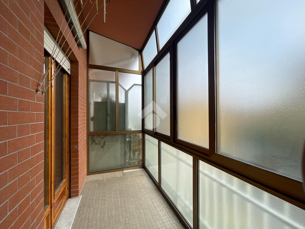 L’abitazione, luminosa e ben distribuita, è composta da ingresso su pianerottolo con portoncino blindato, ampia zona giorno con soggiorno dotato di accesso diretto al terrazzo, provvisto di allaccio acqua, e cucina abitabile con ulteriore balcone. Un disimpegno separa la zona notte, dove si trovano una camera matrimoniale con uscita su balcone verandato — collegato anche al primo bagno finestrato con doccia — e una seconda camera matrimoniale. Il secondo bagno, cieco ma con areazione forzata, è dotato di doccia a muro.